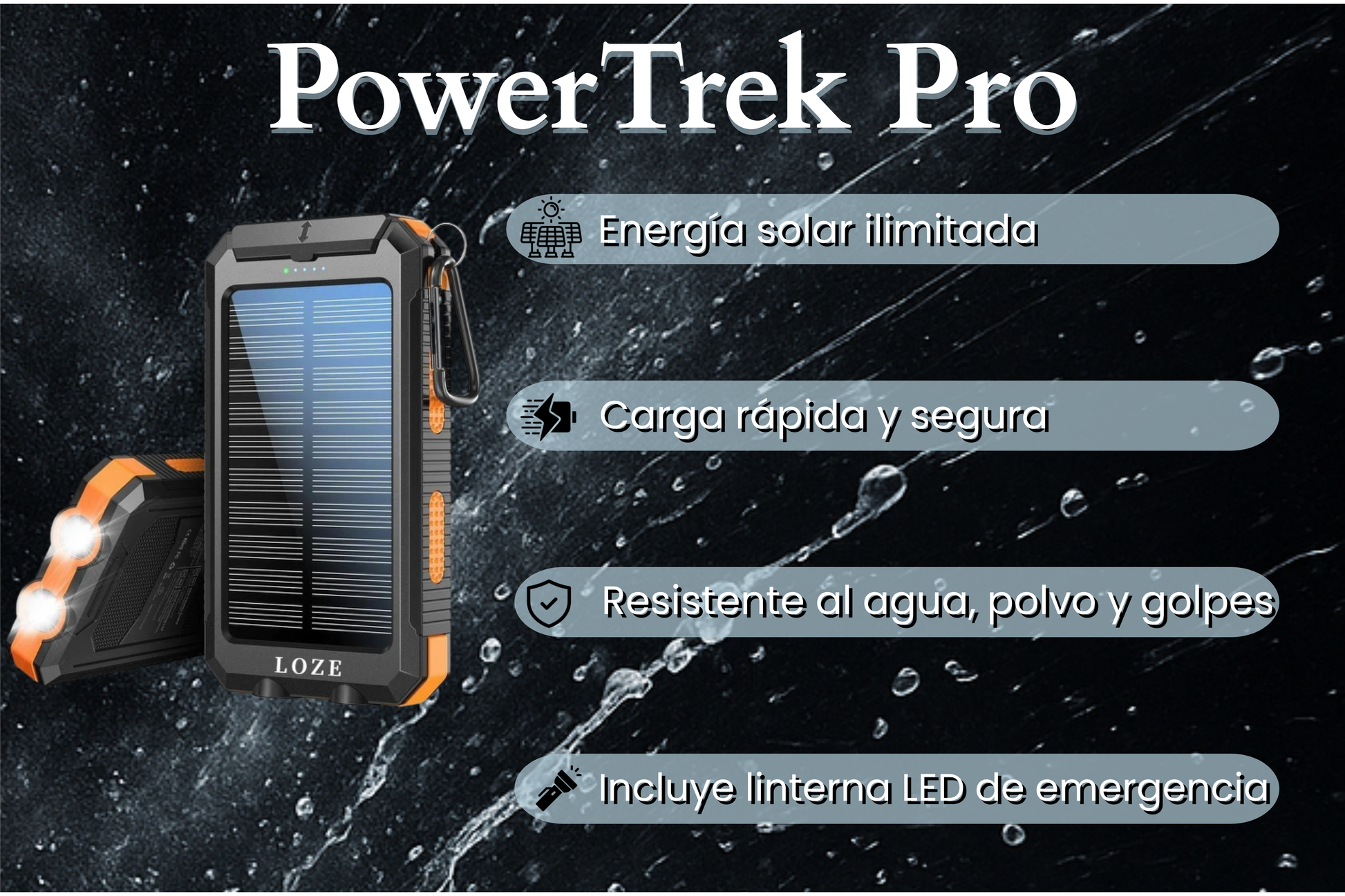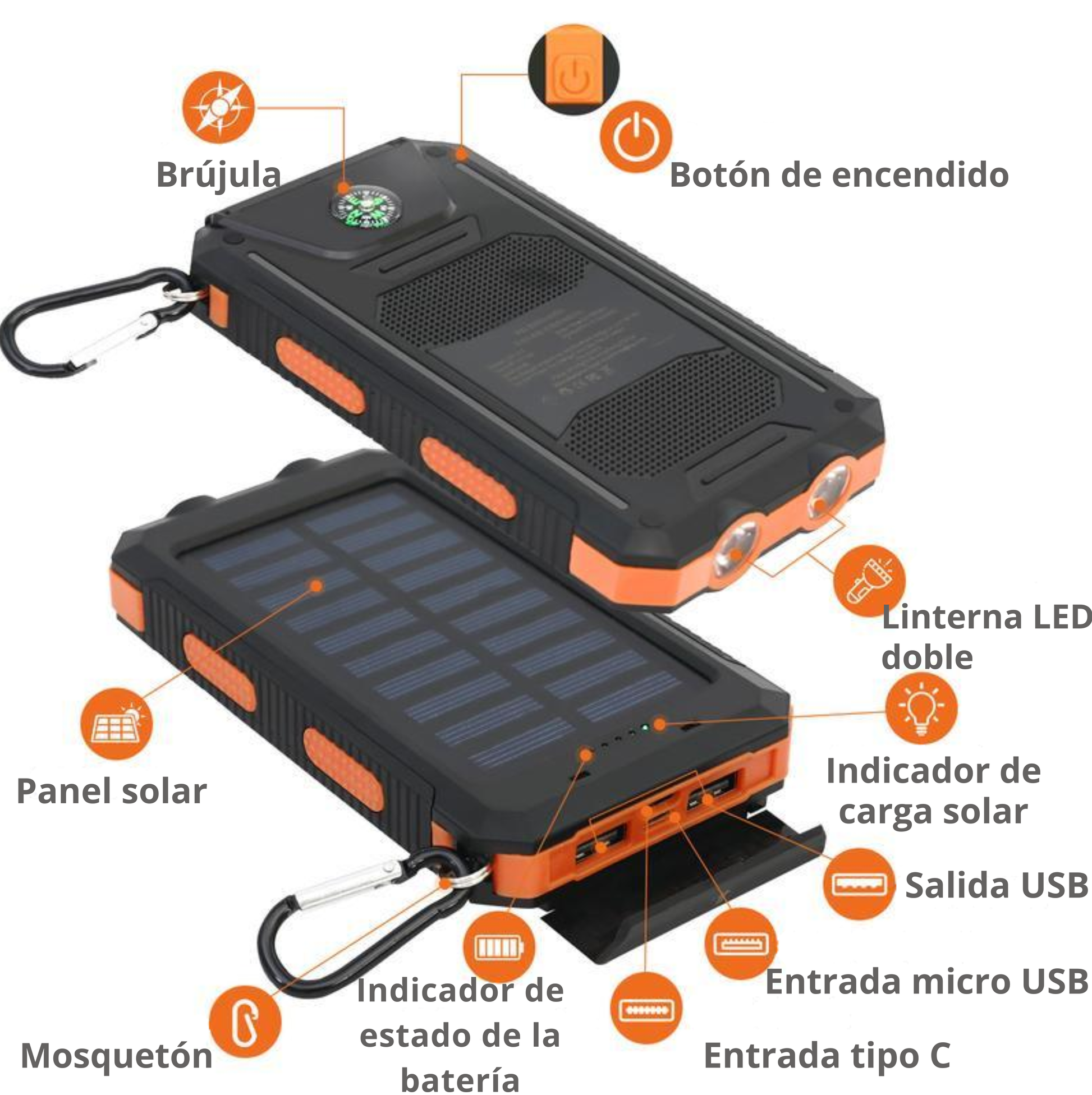 Aprovecha la energía del sol en emergencias o recarga mediante USB para una carga más rápida y eficiente.